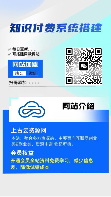 加盟上古云网创,加盟搭建同款知识付费资源网站,实现长期稳定被动收入~